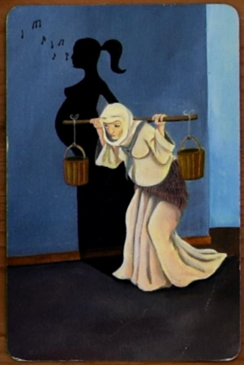 The image itself could be interpreted in many different ways but the one thing that shone through for me in every aspect was strength. The strength of the woman carrying the milk pails, the strength of the shadow going through the struggles of pregnancy but with a happy attitude, the strength of the metaphor that even if the outside looks weak the inside is strong.