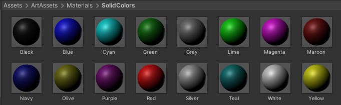 I still felt that I needed some basic solid colour materials to use, just to be able to quickly colour different aspects up if I wanted to. So I create a small set of standard colour materials within unity just using standard Albedo. In addition to this I also created a basic noise texture to add to these and created a subset that use this texture.