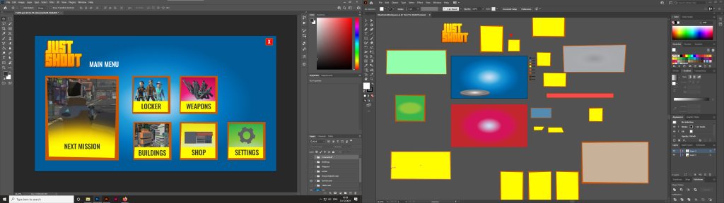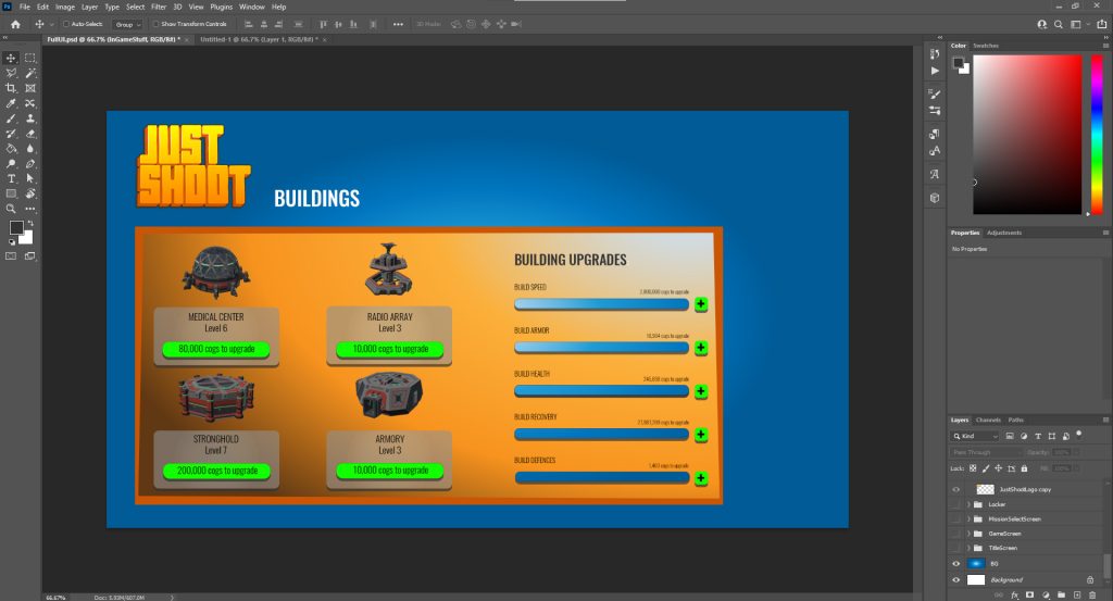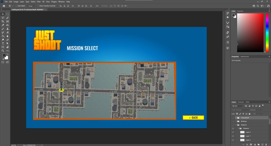 User Experience is something that I can do quite quickly as it has been my specialty for the last 20 or so years. I knew the screens that I needed to create from the aspects that I had coded into the game, weapons, buildings, character, and mission select. I also knew these did not really need to function 100% so was able to quickly create the different screens, cut them up for export and bring them into the game.