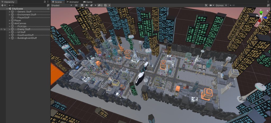 As you can see from the image above there was also the small matter of building a rig controller for the character and also creating a weapon that attached to different aspects of the rig. I learned a lot from following these tutorials, especially surrounding character rigging and animation as I had not really explored these before, however the most exciting thing I discovered was a way to create animations using this Rig Builder at runtime. By creating a function within the script you can save out an animation clip, this was utilised to create the different weapon pose animations depending on whatever gun was in the players hand. All I needed to do was run the game and place the weapon onto the player, I could then use the Rig Builder and associated rig constraints to pose the player so that they were holding the gun correctly and save out the final pose as an animation that I could then use in the animation controller to using layer weights to animate the player holding different weapons.